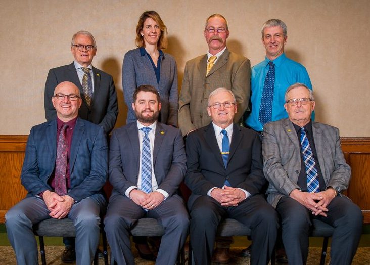 2020 OSCIA Executive Committee back row (L-to-R) – Harold Rudy, Deanna Nemeth (OMAFRA), Chad Anderson & Steve Sickle front row (L-to-R) – Andrew Graham, Warren Schneckenburger, Stuart Wright & Les Nichols